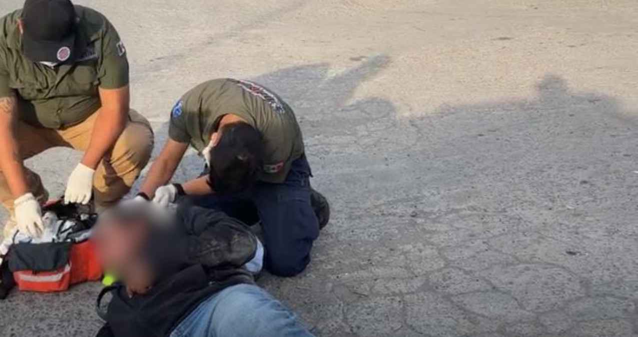 Un repartidor motociclista, que a pesar de haber sufrido lesiones en la cabeza logró ponerse de pie, luego de impactar su unidad de dos ruedas contra la puerta trasera de una camioneta en la avenida del Niño, en Matamoros, Tamaulipas.
