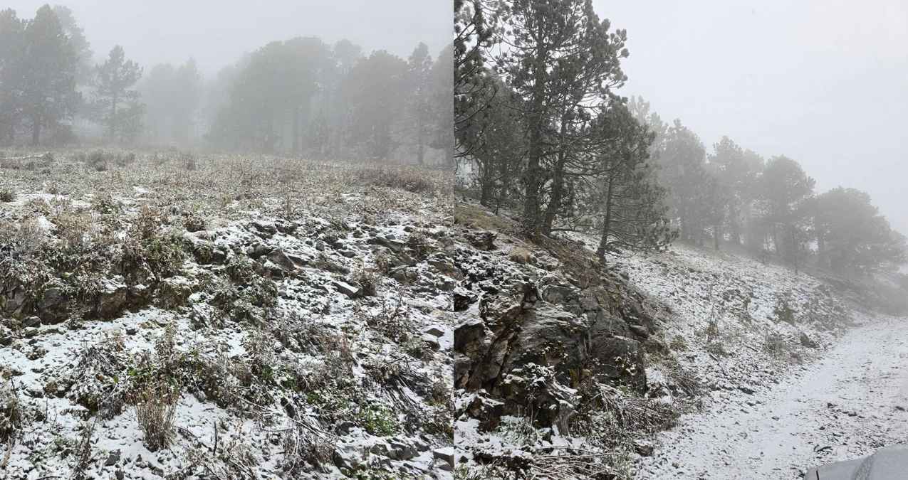 La nieve comenzó a caer en las partes más altas del Cerro del Potosí, en el municipio de Galeana, Nuevo León, según informó Protección Civil del estado.