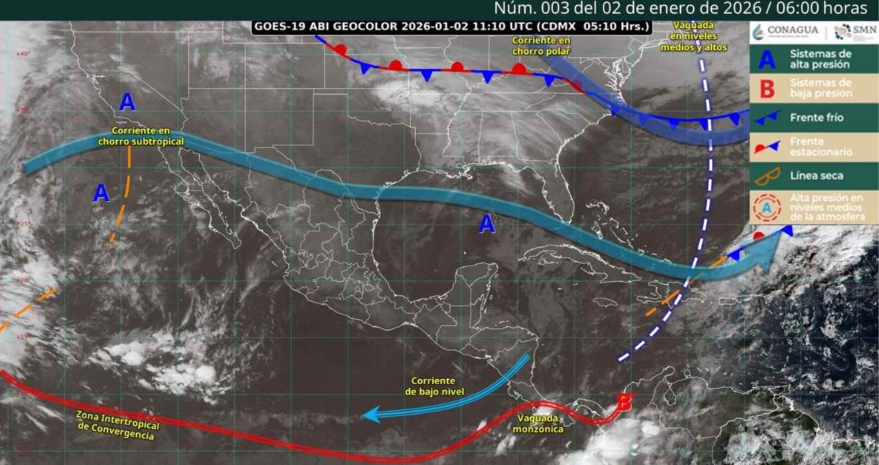 Temperaturas en estados de México hoy 2 enero 2026. El día de hoy, el ingreso de humedad del océano Pacífico generará lluvias y chubascos en zonas del occidente, sur y sureste del territorio mexicano.
