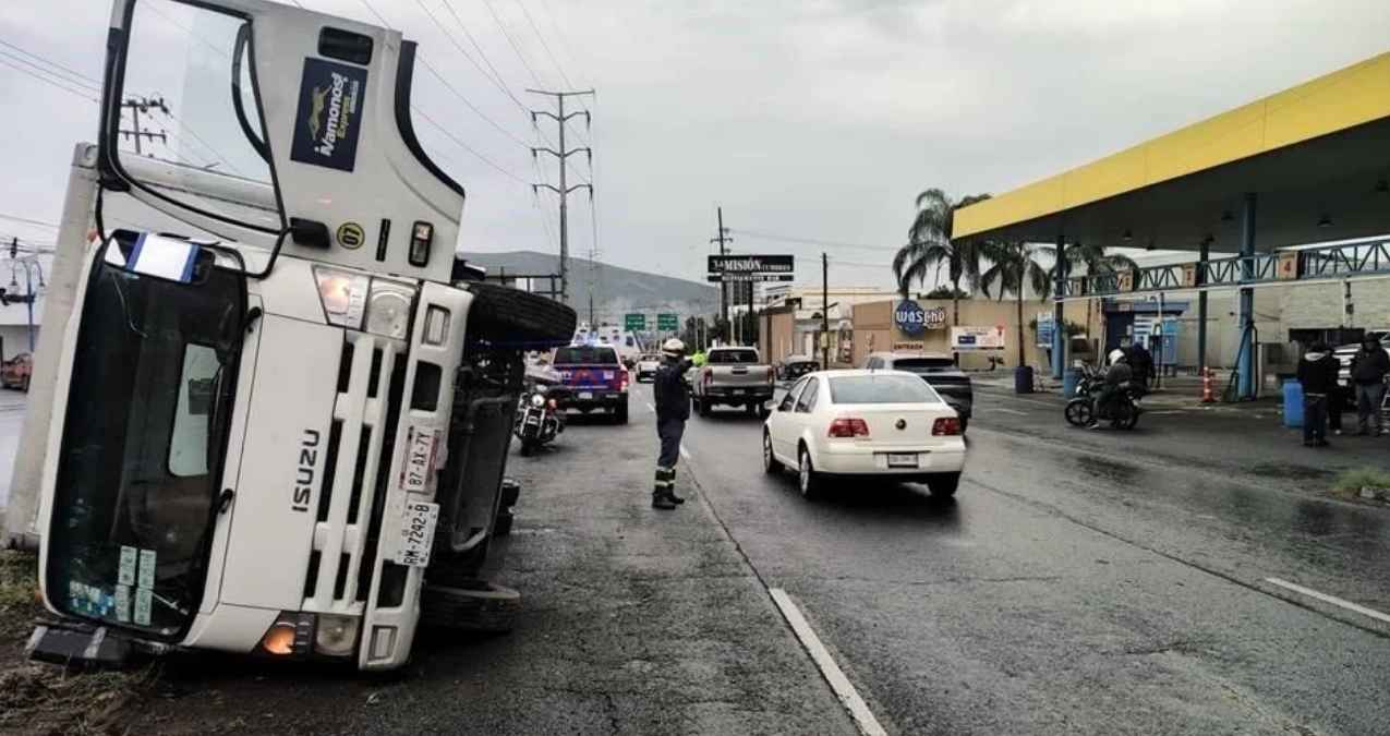 Volcadura de camión de paquetería en Monterrey genera congestión vial